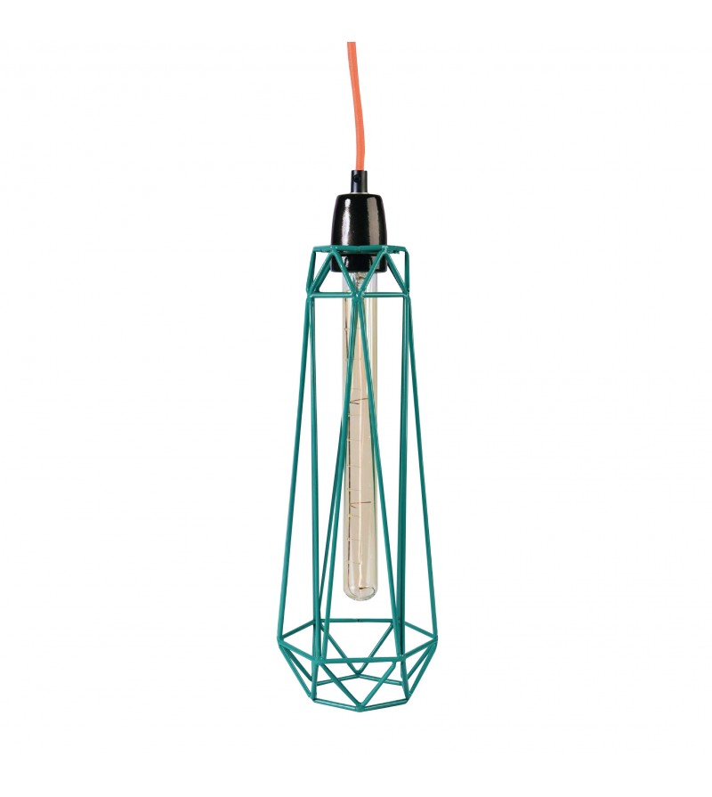 Descripción: Lámpara de estilo vintage. Su pantalla está realizada por una estructura de hilo metalizado que deja entre ver su peculiar bombilla de filamentos. Está disponibles en 6 colores: azul con cable naranja, naranja con cable gris, negro con cable rojo, oro con cable negro y azul mentolado con cable amarillo. La lámpara incluye bombilla de filamento 30x300mm E27-E26 y cable textil de color. También puedes elegir solo la estructura y el cable. |